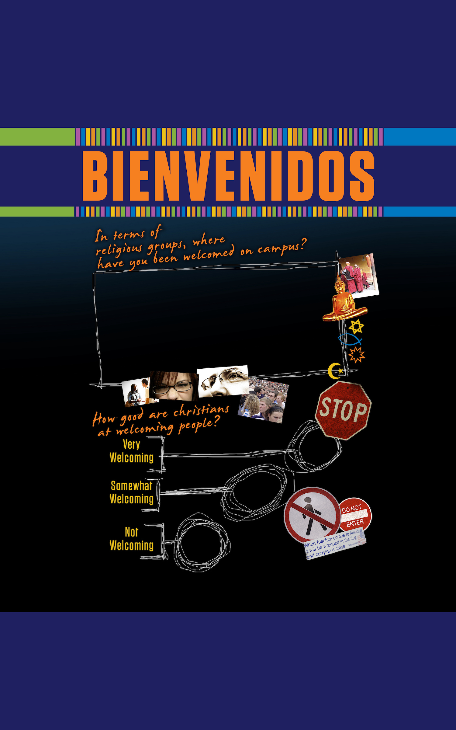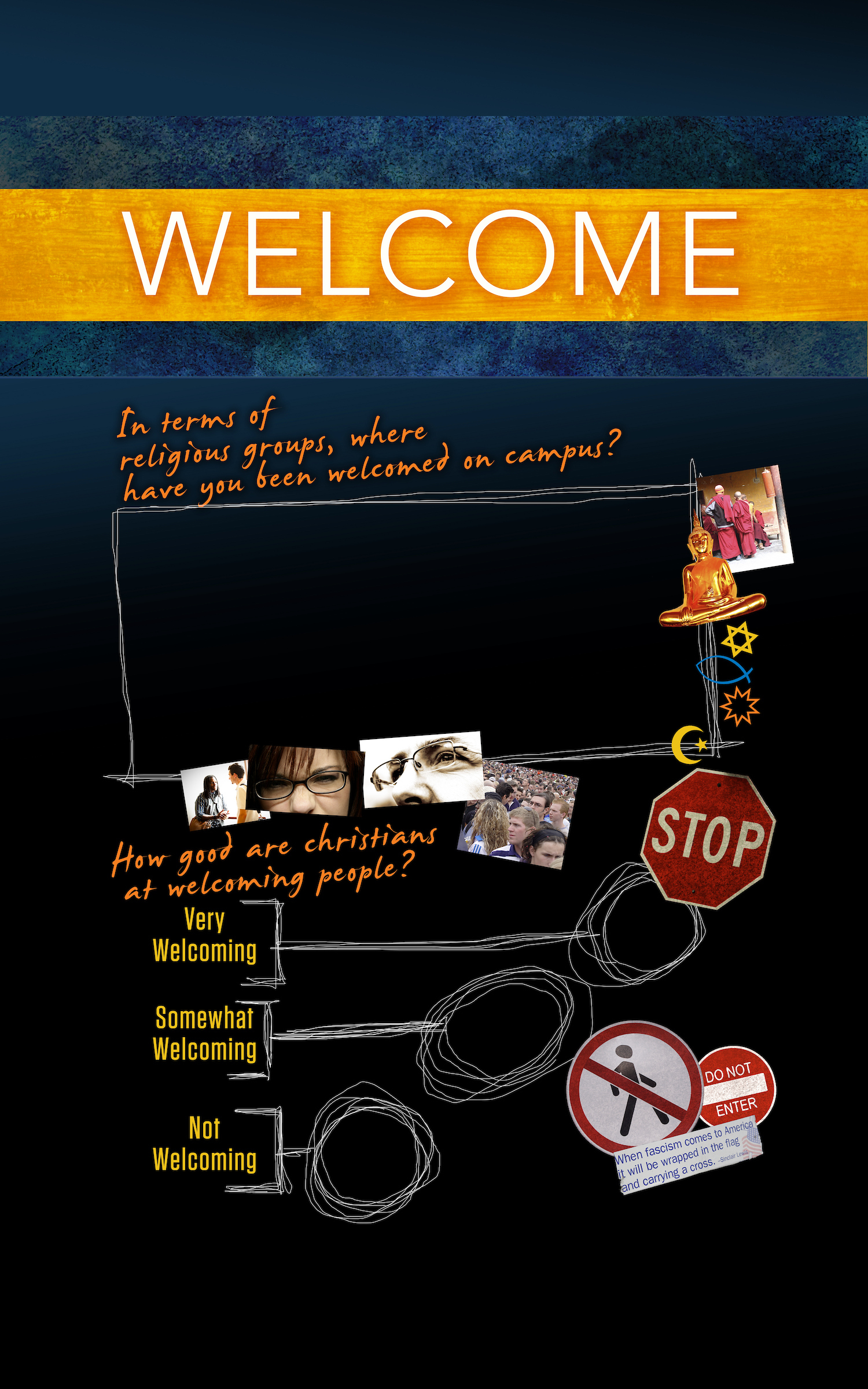 Our God is a God of welcome, God invites us into relationship. Are our campuses and churches welcoming places for students? Do our fellowships extend welcome and hospitality. Jesus says "I stand at the door and knock. If you hear me calling and open the door, I will come in and we will share a meal as friends. (Rev. 3:20) Let's communicate God's love through our lives, and make sure that people know about God's invitation to them. Use these three interactive visual displays to spark spiritual conversations and share God's welcome with the campus.