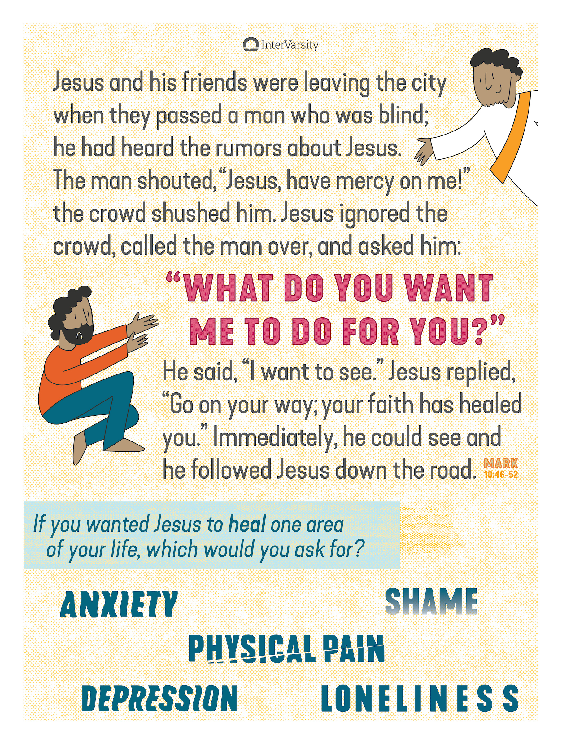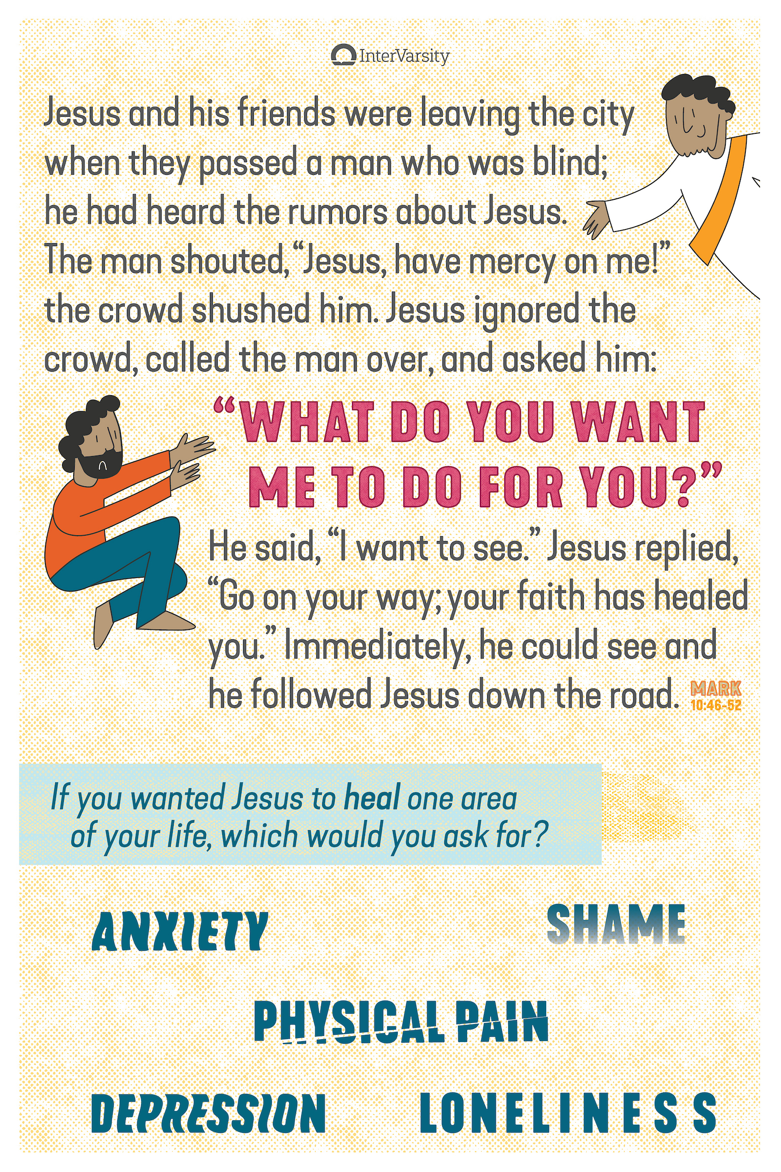 - Panel 2: We hear Jesus ask a blind man, "What do you want me to do for you?" and offer prayer for where the person wants healing.