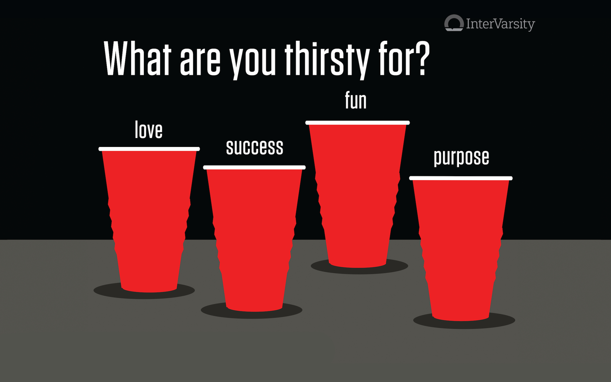 This short video description of the Red Cup Proxe station is designed to be followed up with stories of Red Cup and how it impacts both students on campus and InterVarsity leaders who have the opportunity to share the Gospel. A proxe station is a visual display that asks a provocative question. Students respond to the question and then an InterVarsity student follows up with a conversation that easily leads to who Jesus is and how he answers the question. In this case the question is, "What are you thirsty for?" This question translates easily to how Jesus quenches our thirsts.